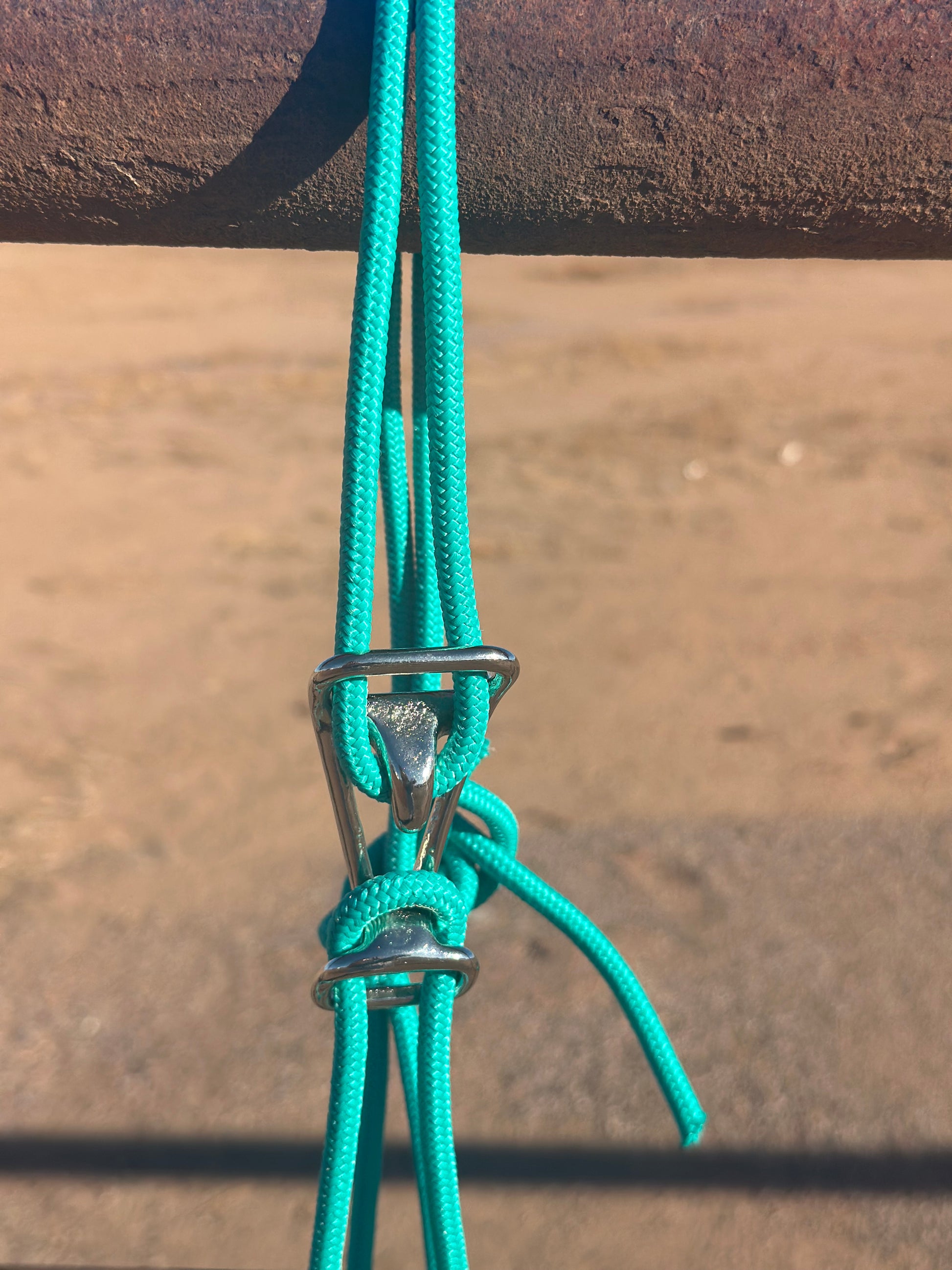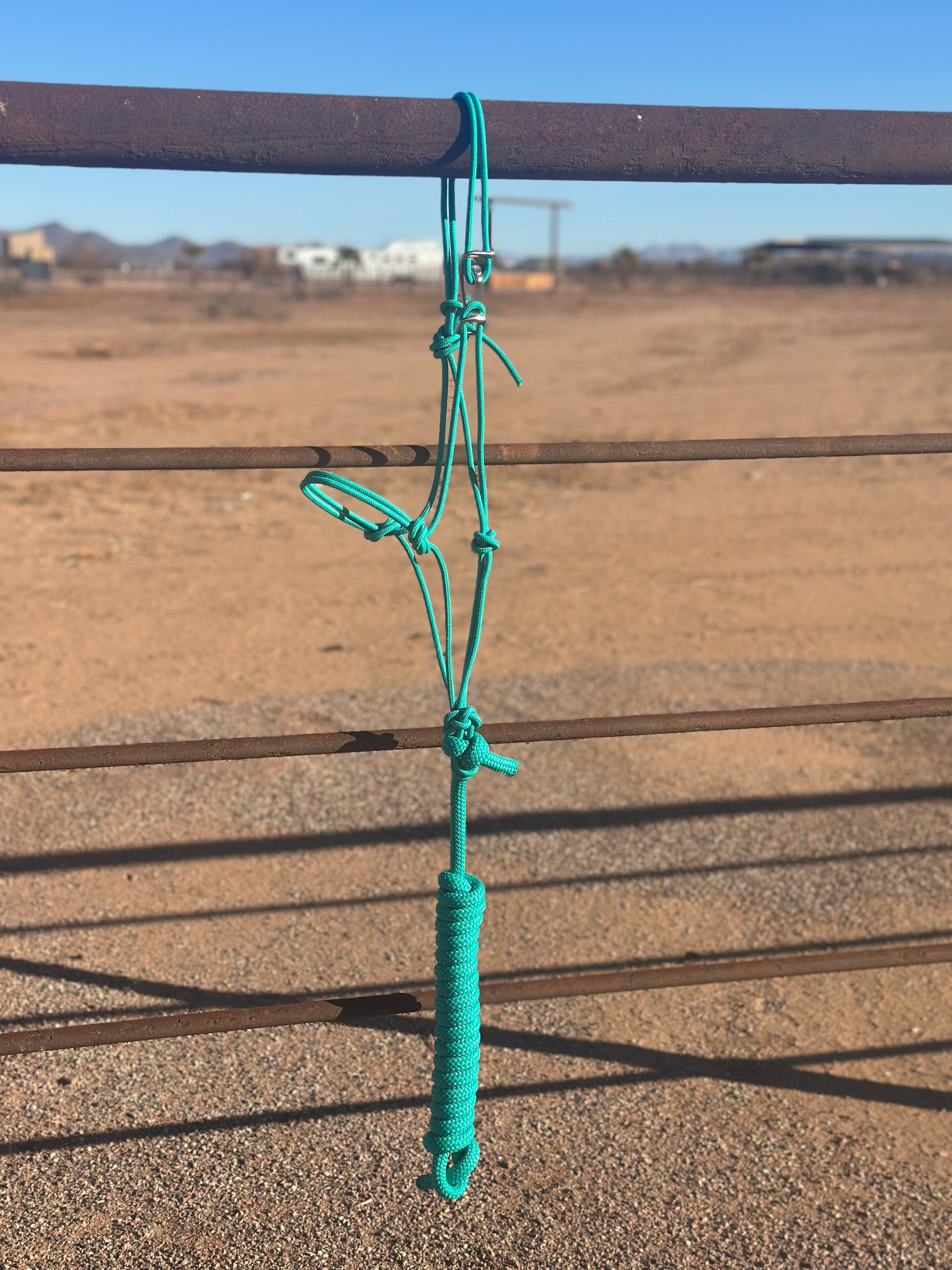 Turquoise easy hook halter with coordinating turquoise lead rope 10’ long.