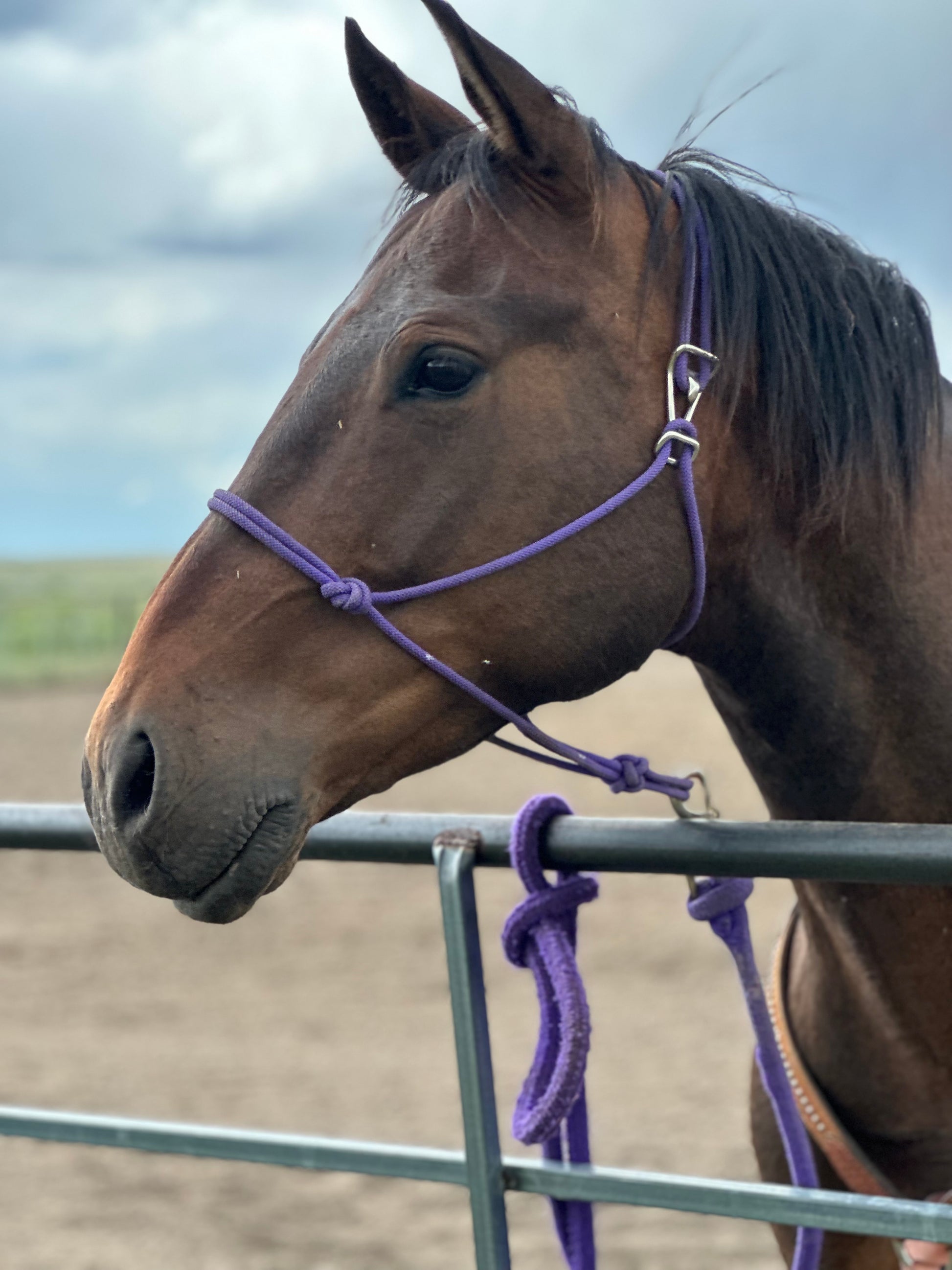 Standard horse sized purple easy hook halter with coordinating purple lead rope.