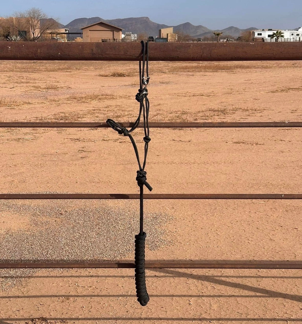Yearling easy hook rope halter with 10’ top quality clinician style lead rope. All halters are hand tied out of American made materials.